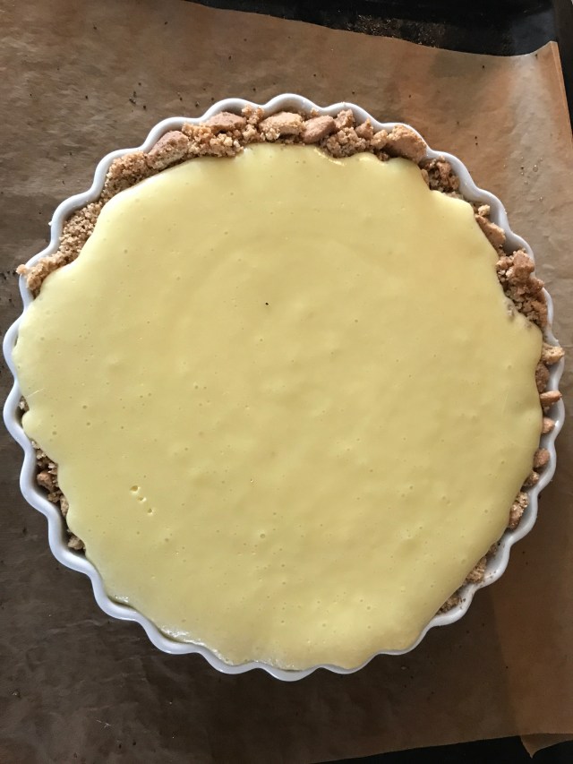 Bunden kommes i en tærteform og trykkes godt op langs kanterne og fyldet fyldes i.